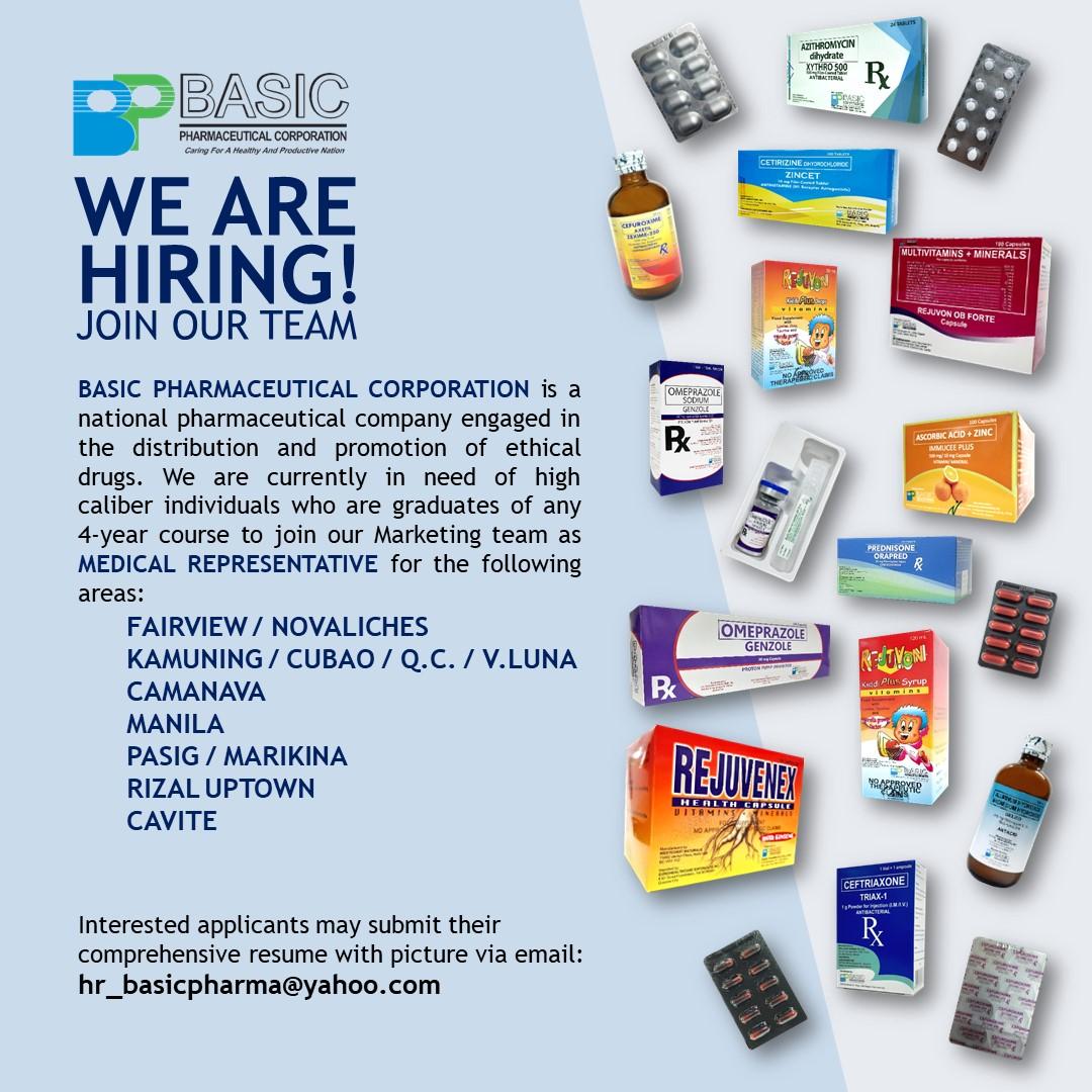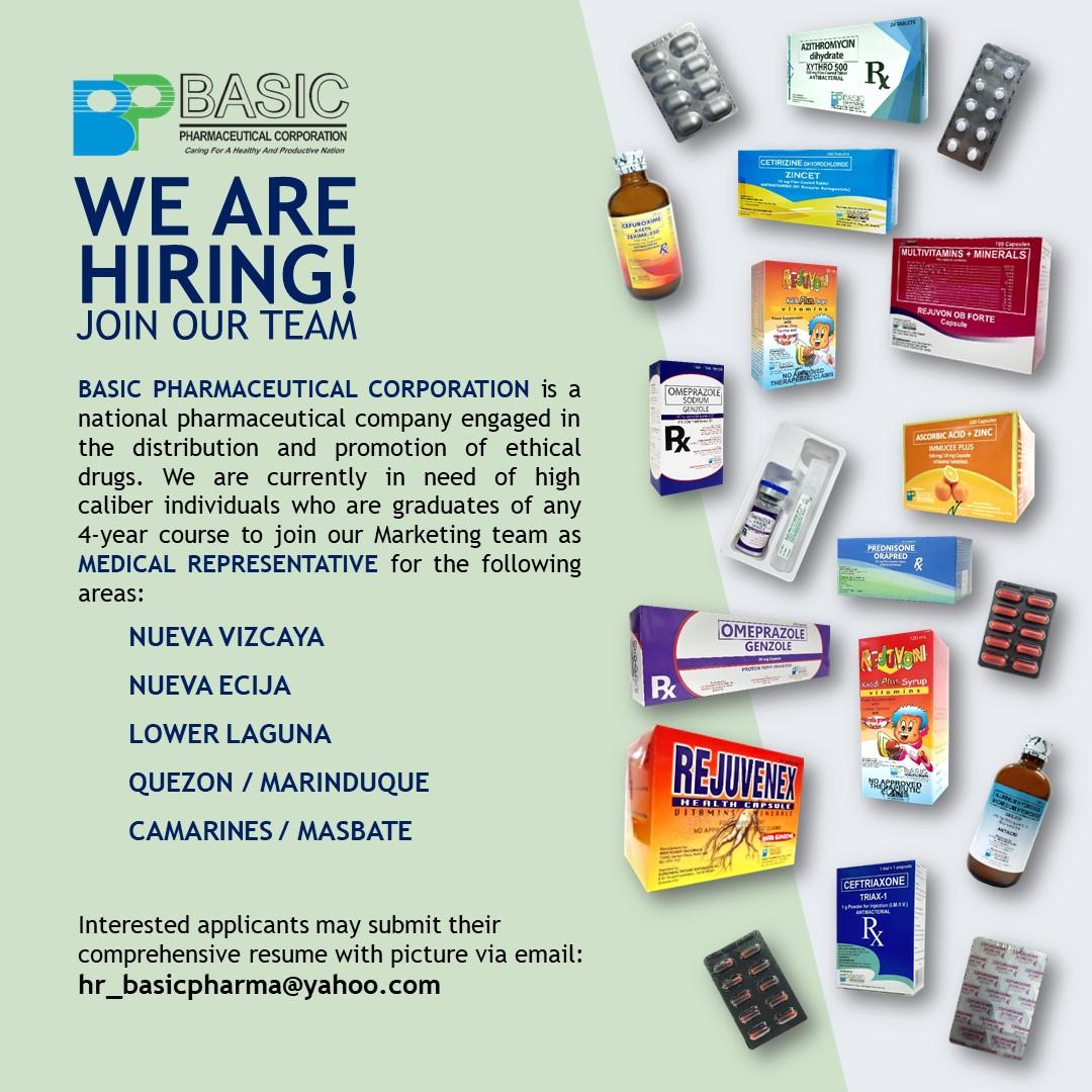 Luzon Team - Interested applicants may submit their comprehensive resume with picture via email: hr_basicpharma@yahoo.com